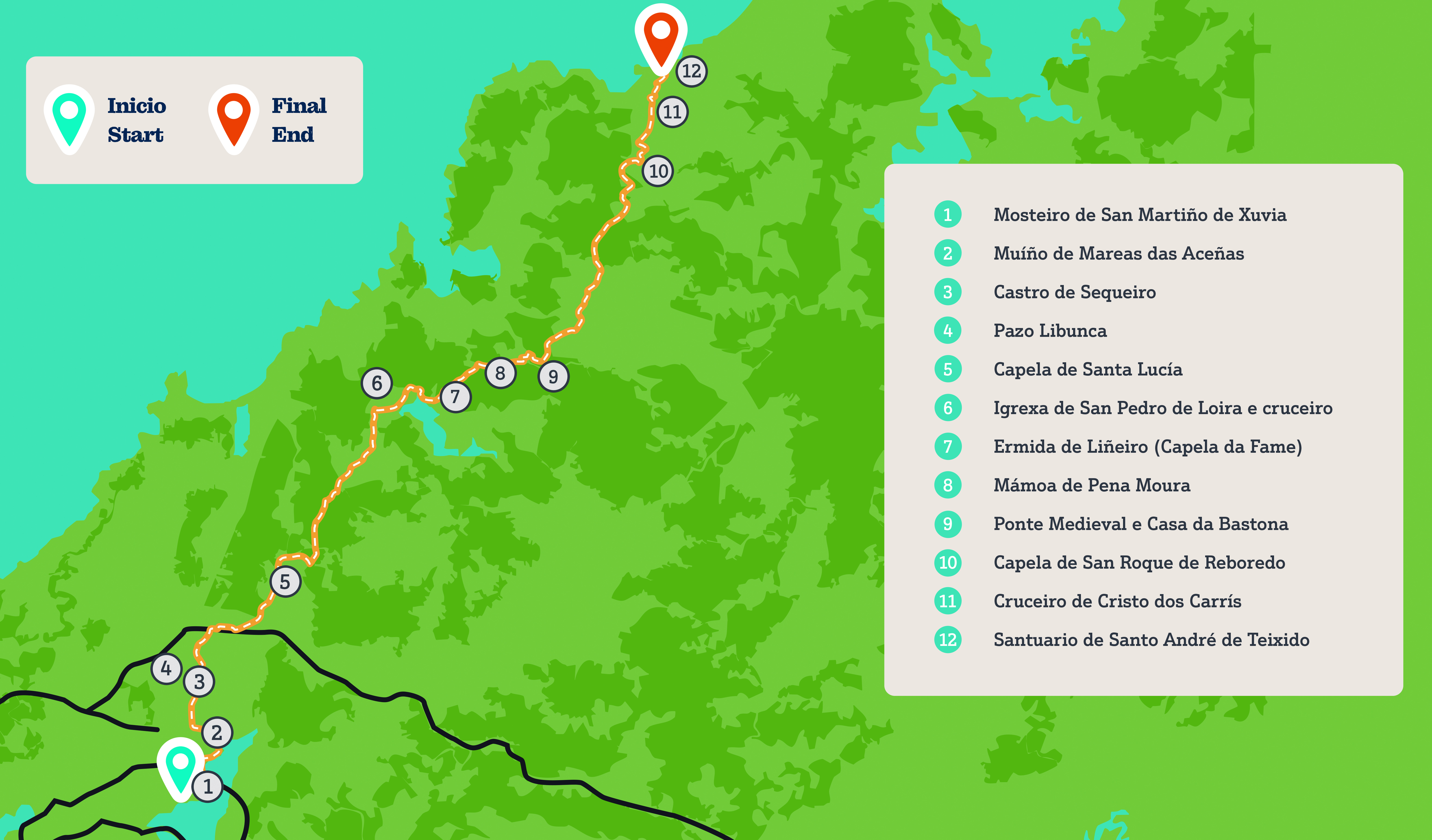 Haz click aquí para escuchar la descripción general de la ruta en los tres idiomas. Haz click sobre cada punto de interés para escuchar la descripción en gallego, castellano o inglés.